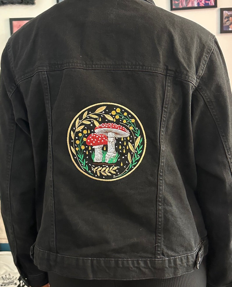 Step into the enchanted forest with this one-of-a-kind black denim jacket featuring a beautifully embroidered mystical mushroom design. Centered within a circular motif, the toadstool is surrounded by delicate ferns, twinkling stars, and subtle cosmic accents – a perfect blend of woodland magic and celestial charm. Ideal for nature lovers, forest witches, and anyone drawn to the mysterious beauty of the natural world.