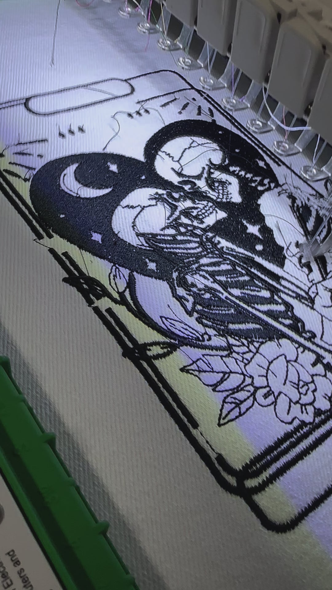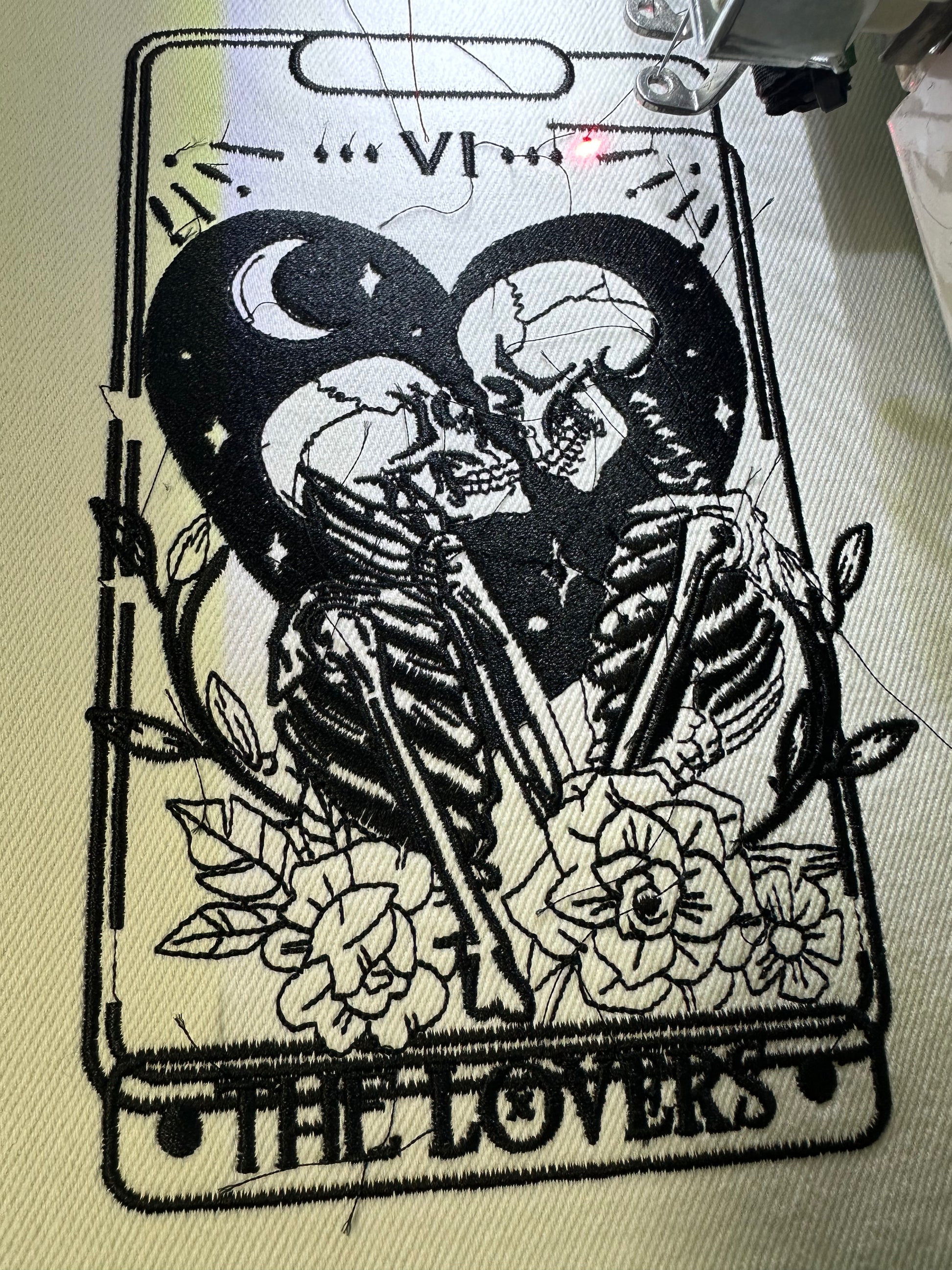 This romantic and mystical white denim jacket features a striking embroidered Tarot card design titled The Lovers, stitched in bold black thread. At its center, two lovers embrace, symbolizing deep connection, divine union, and choice. Minimalist yet meaningful, this piece brings a sense of magic and intention to your wardrobe.