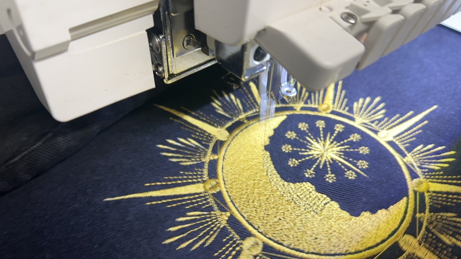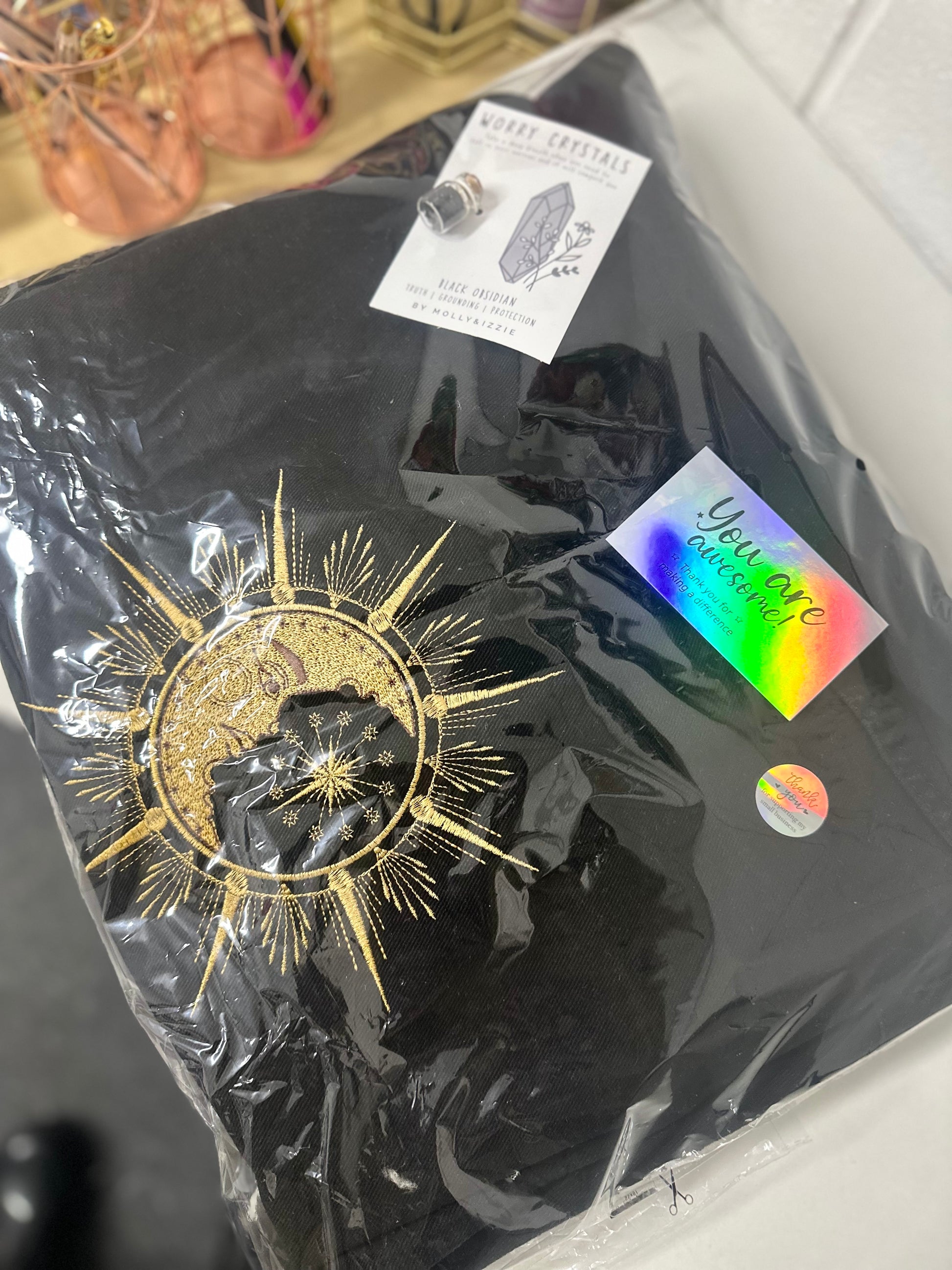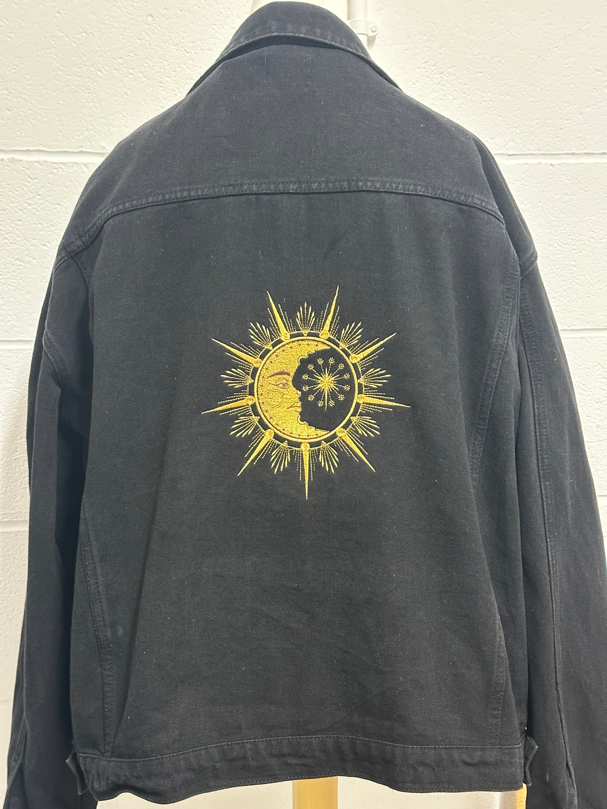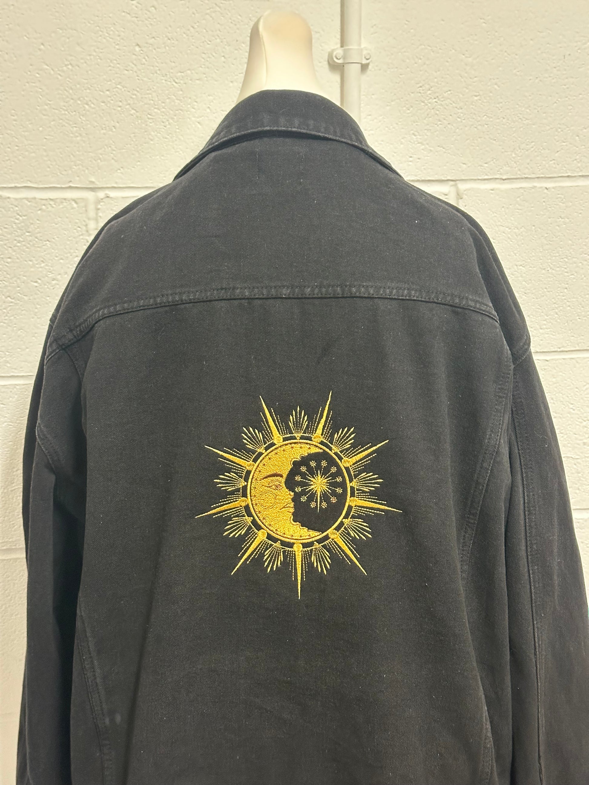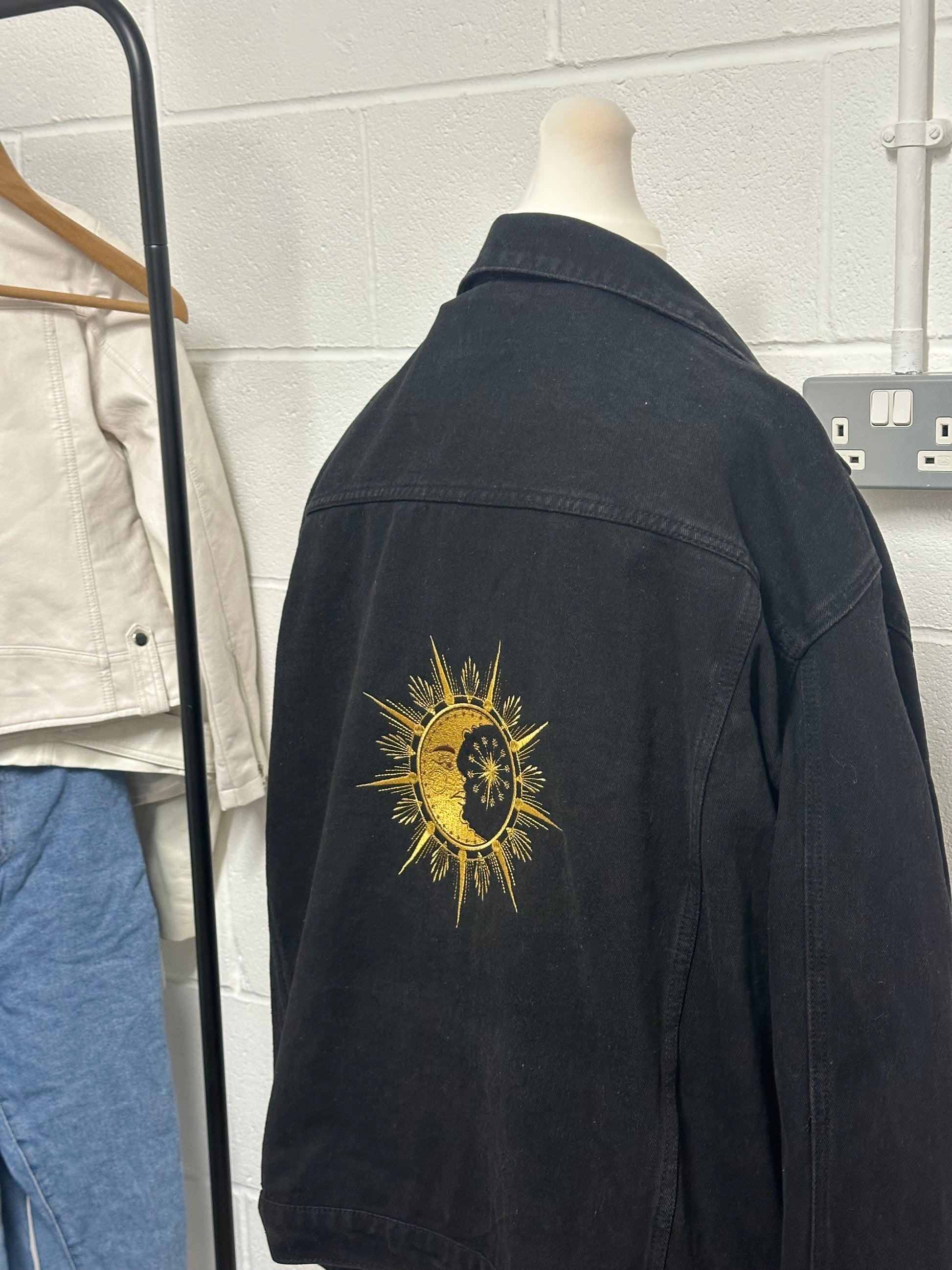 Wrap yourself in celestial magic with this handcrafted black denim jacket, featuring intricate star and moon embroidery. Made with care and attention to detail, each design element is stitched to evoke a sense of cosmic wonder and timeless style. Perfect for layering over any outfit, this jacket is both edgy and ethereal – a wardrobe essential for stargazers, moon lovers, and dreamers alike.